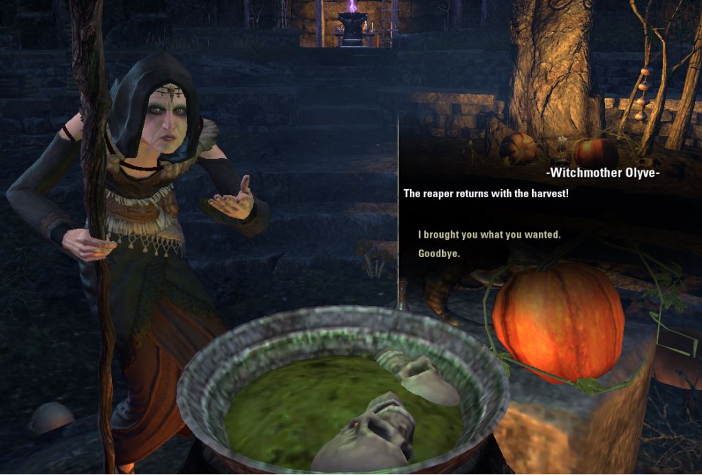 Usando o apito fará Witchmother Olyve aparecer em uma nuvem de corvos. Ela irá solicitar que você obtenha uma abóbora , tripas e um “Essence of Death“. Para obter a essência, você tem que matar o chefe de qualquer Delve fora de Cyrodiil .